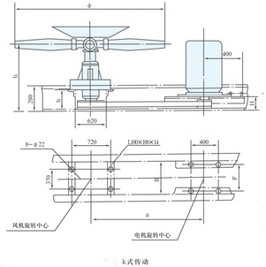 适用于3.6米和4.27米风机,吊挂式、鼓风式,风机所配电机,安装尺寸见表